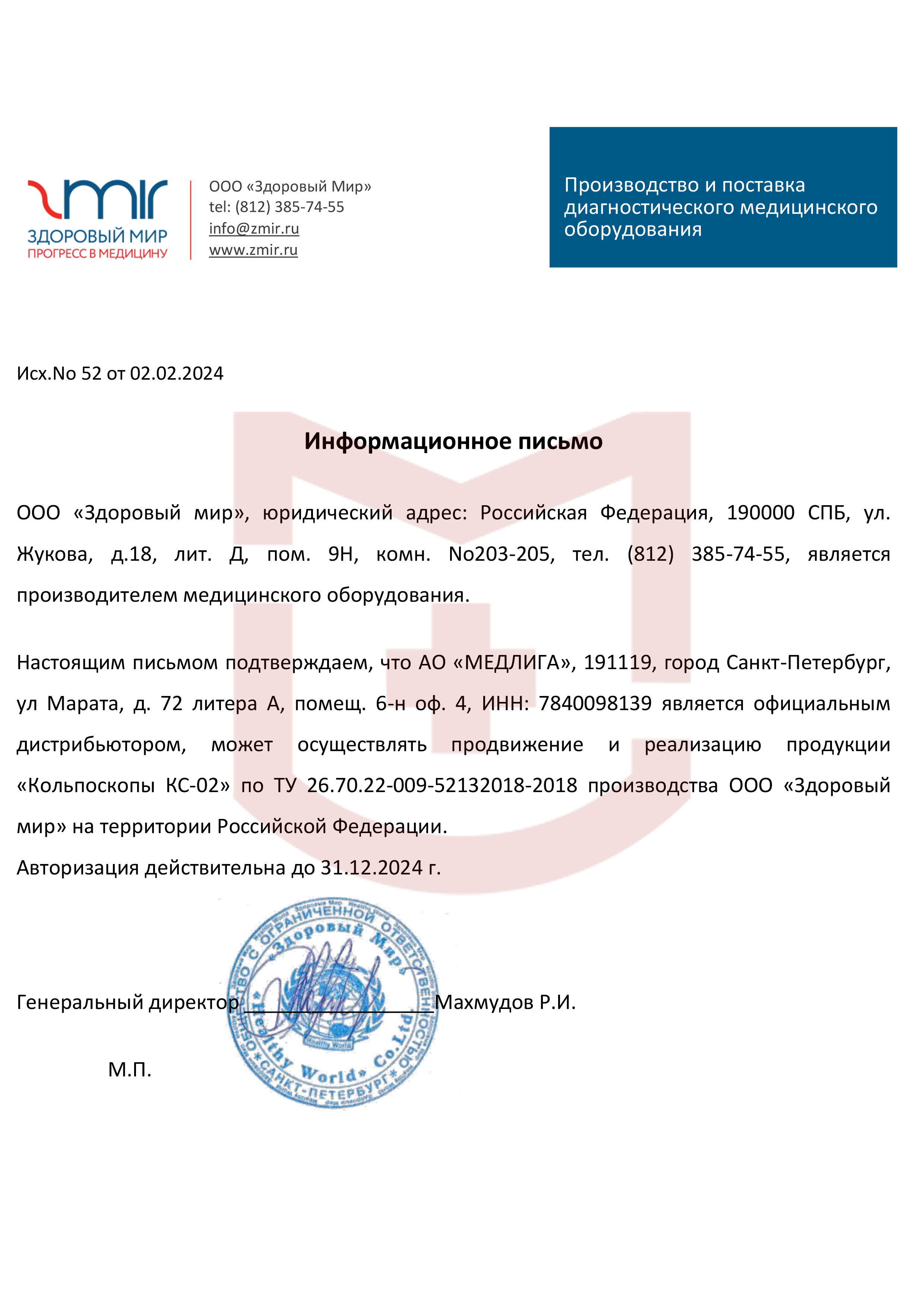 Авторизационное письмо Zmir от 2024 года