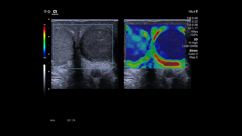 Strain-режим визуализации отличается очень высокой чувствительностью к деформации, что позволяет использовать вместо циклов принудительного сжатия естественную компрессию, создаваемую дыханием пациента и сердечными сокращениями для получения эластограммы относительной жесткости.