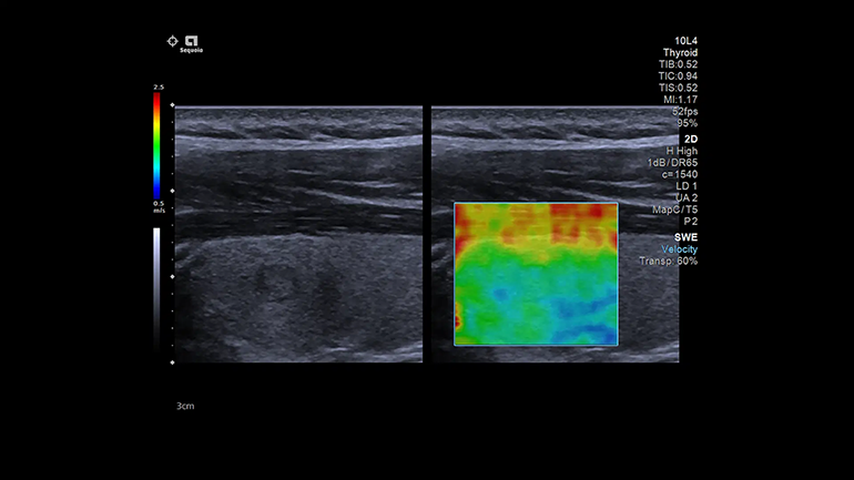 В режиме 2D SWE высокая плотность оцифровки ЭХО-сигнала обеспечивает высокое пространственное разрешение и отличные результаты по значениям жесткости для повышения качества визуализации очаговых поражений и диффузно-неоднородных тканей. Измерения можно выполнять в заданных локациях для определения жесткости ткани, используя значения м/с или кПа.